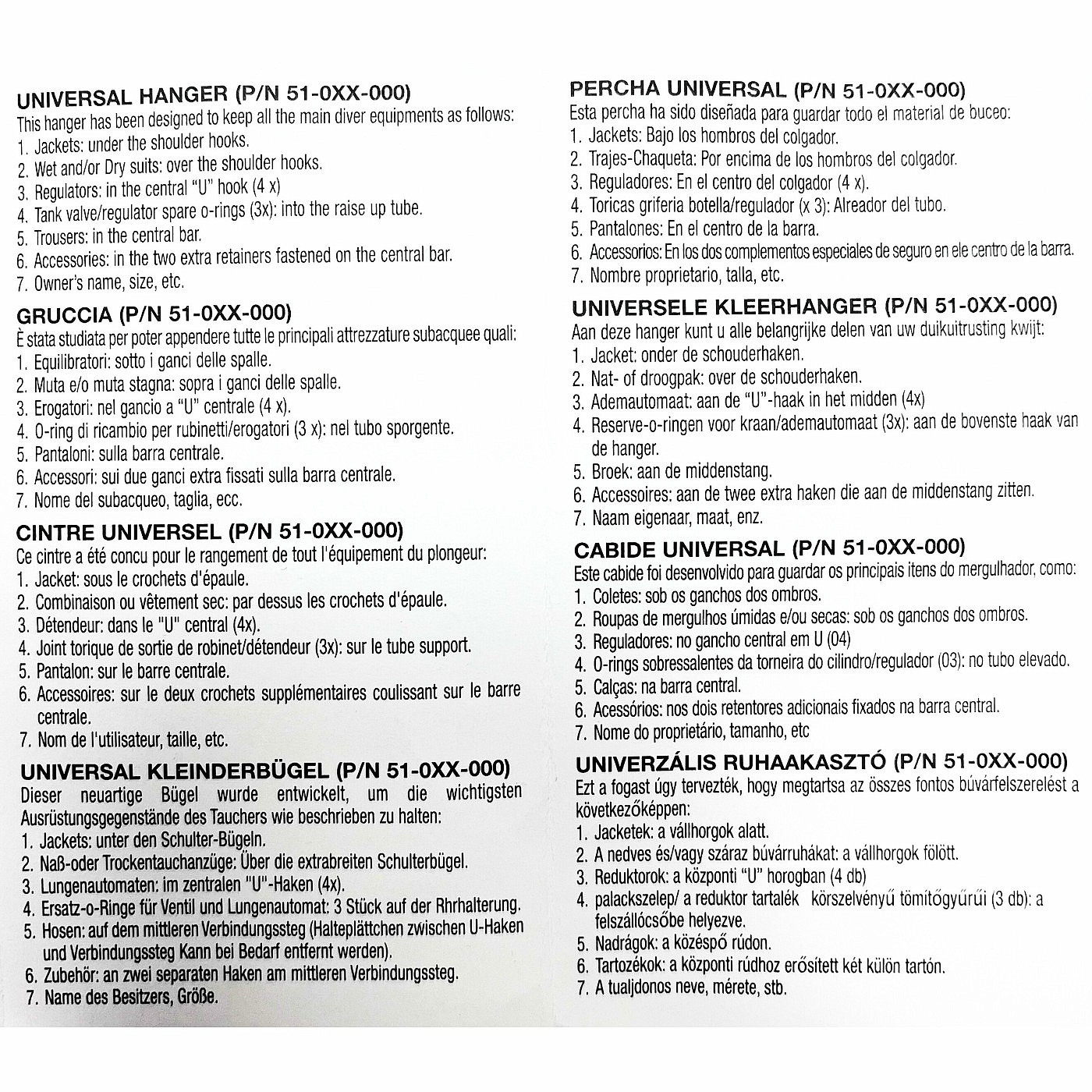 Egy neoprén öltönyt könnyedén akaszthatunk a főrúdra vagy vállkampóra, az U horgok pedig automaták felakasztására jók. A felhajtóerő kompenzátor tökéletesen illeszkedik a vállkampókra. A neoprén cipőket speciális tartókra rögzítheti. A helye a búvárhenger szelepének o-gyűrűinek is szolgál.
